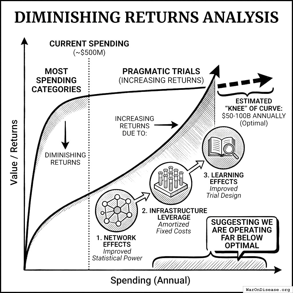Extreme underinvestment in pragmatic trials: At 9,900% below OSL with 637:1 BCR, this is the single largest misallocation in the federal budget (see Section 6 for full derivation)