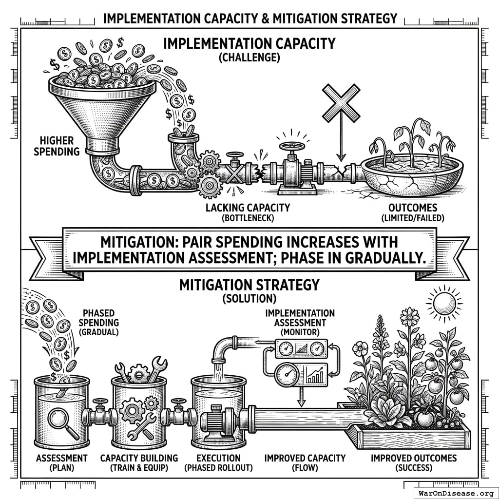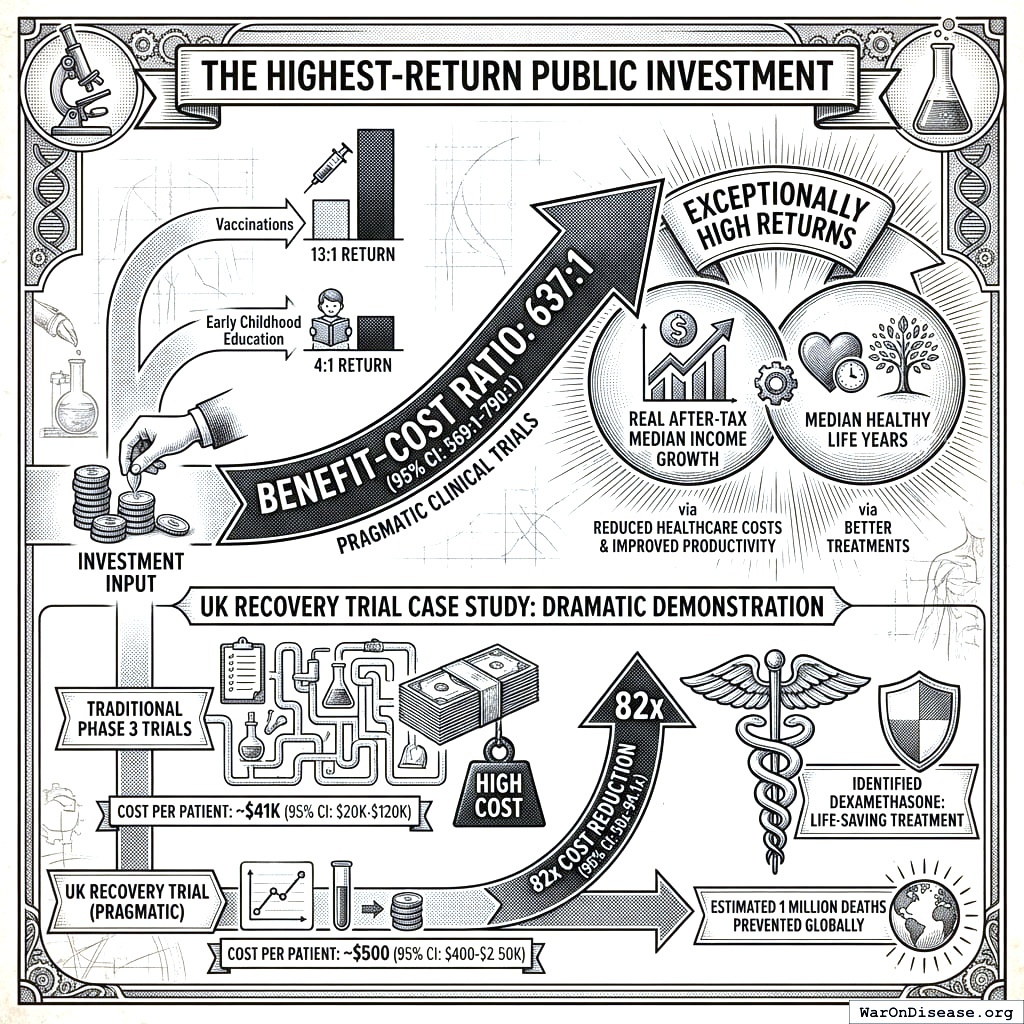 The result: systematic overinvestment in low-return categories and underinvestment in high-return categories. Historical examples demonstrate the scale of missed opportunities: the smallpox eradication campaign returned an estimated 450:1 ROI93, yet similar high-return public health investments remain chronically underfunded.