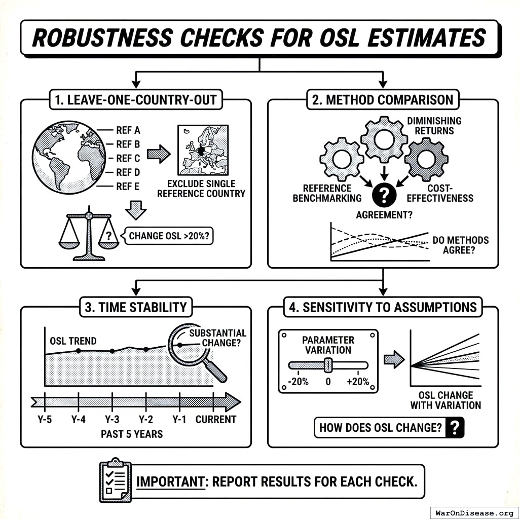 The following table demonstrates how OBG output would appear. OSL estimates for fully derived categories (pragmatic trials, vaccinations) come from the worked examples in Sections 6-7. Remaining OSL estimates use cross-country benchmarking.