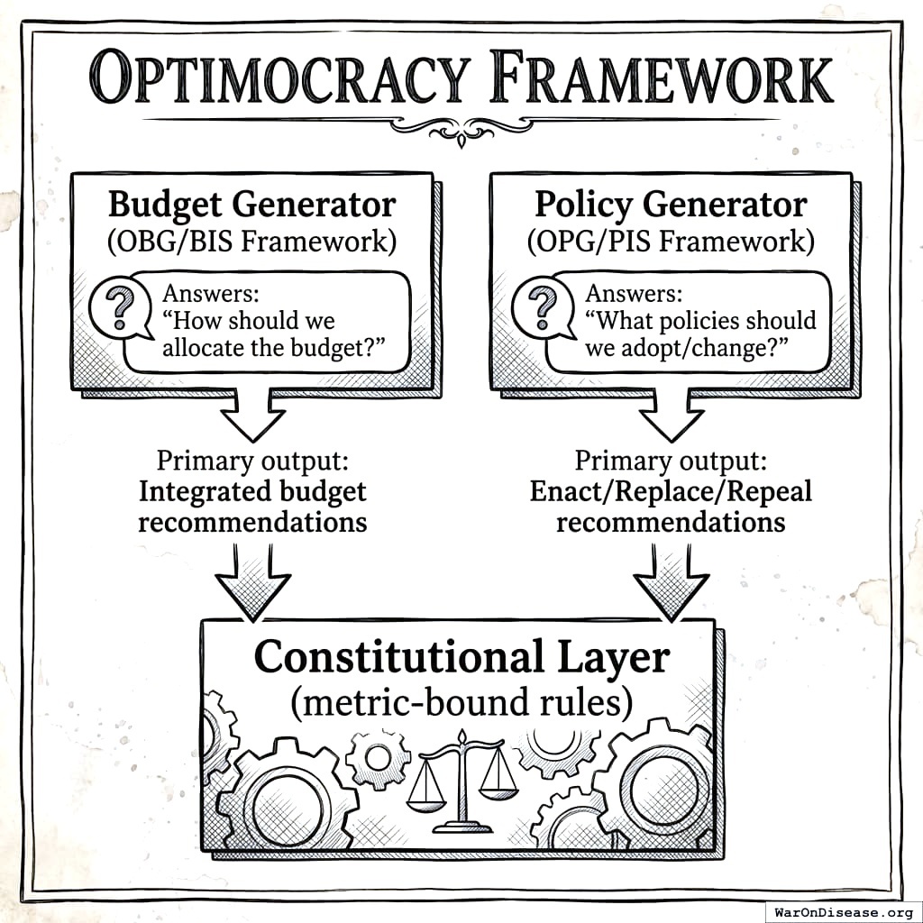 Scale note. If budget allocation is the core bottleneck, the upside from fixing it is civilization-scale. Under the project’s best-case governance ceiling, the recoverable upside is $101T per year. The 20-year Optimal-Governance Path reaches 56.7x the Earth baseline, raises average income to $1.16M versus $20.5K on the status-quo path, and reaches $10.7 quadrillion in total output. This specification focuses on the allocation layer of that plan; the full derivation lives in The Political Dysfunction Tax46.