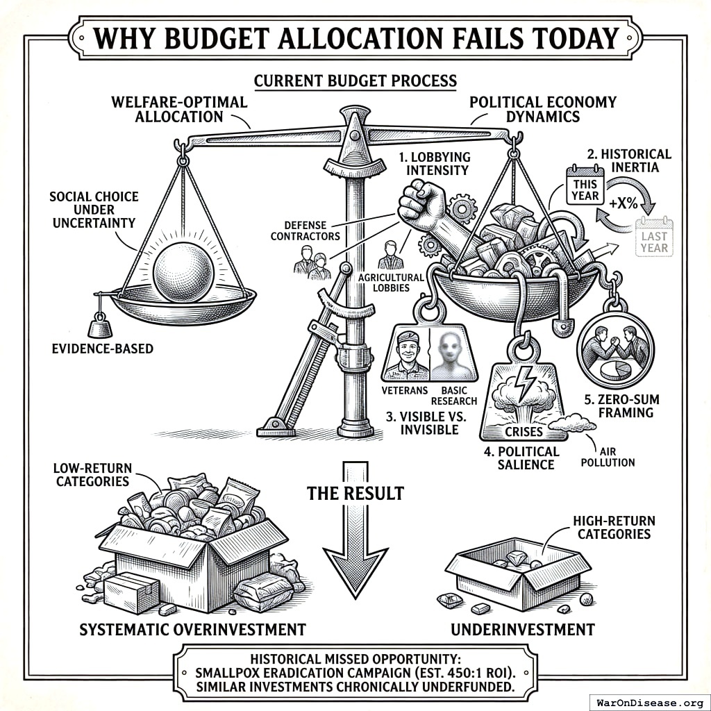 Budget allocation is fundamentally a problem of social choice under uncertainty140. The challenge is not simply technical but institutional: current budget processes systematically diverge from welfare-optimal allocations due to political economy dynamics141,142.