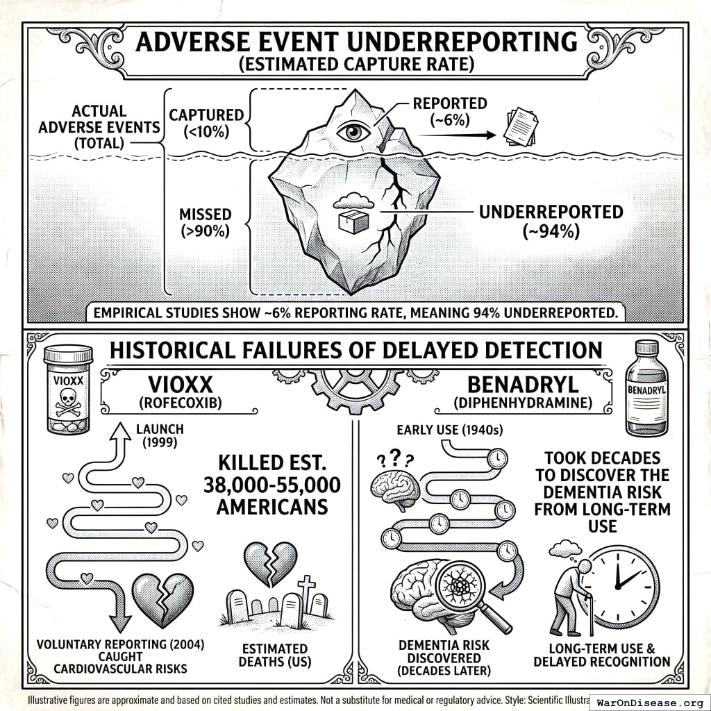 After approval, the FDA monitors safety using FAERS, a system where doctors voluntarily report problems if they feel like it. It captures less than 10% of actual adverse events154. Vioxx killed an estimated 38,000-55,000 Americans155 before this honor system noticed. That’s more people than died in the entire Korean War, detected by a system that relies on doctors filling out optional paperwork. I want to be clear: the 8.2 years delay is supposed to be for safety. And then the safety monitoring after approval is a suggestion box. You waited 8.2 years to get to the suggestion box.