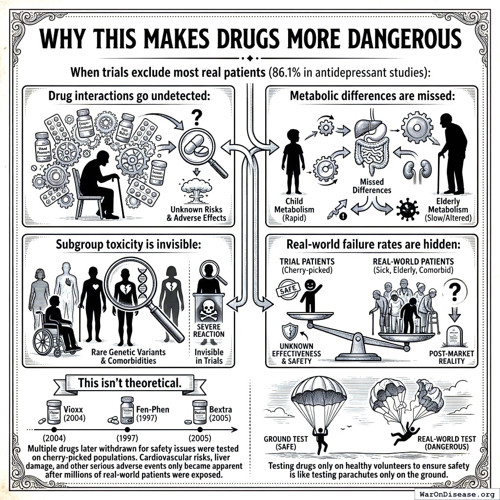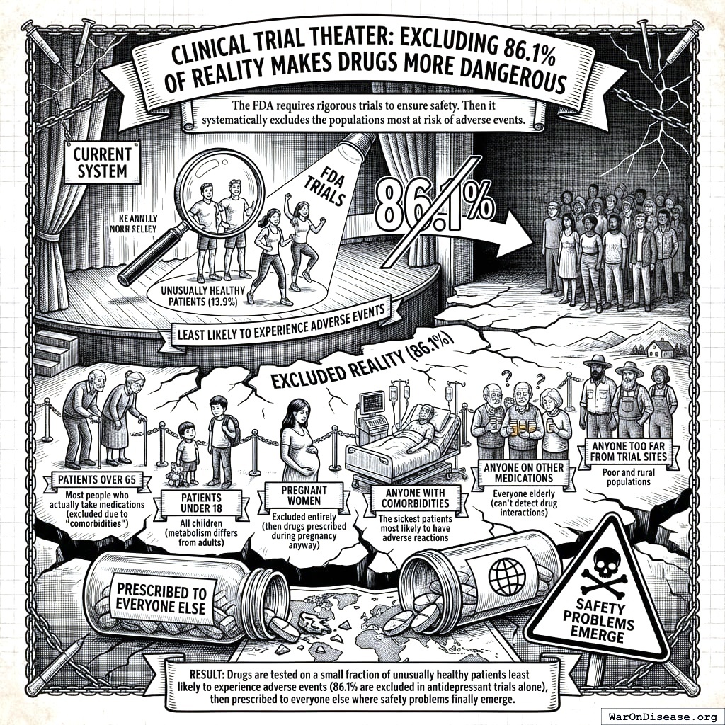 Result: In antidepressant trials alone, 86.1% of real patients are excluded. The drugs are tested on the healthiest people alive, declared “safe and effective,” then handed to everyone the trial specifically avoided. Nobody knows whether the drug works for those populations, what the interactions are, or what the real adverse event profile looks like. This is how Vioxx, Fen-Phen, and Bextra all got approved, celebrated, prescribed to millions, and then withdrawn after killing people whose demographics the trials had carefully excluded. The 8.2 years delay didn’t make these drugs safer. It made them seem safer by hiding the danger behind an exclusion list.