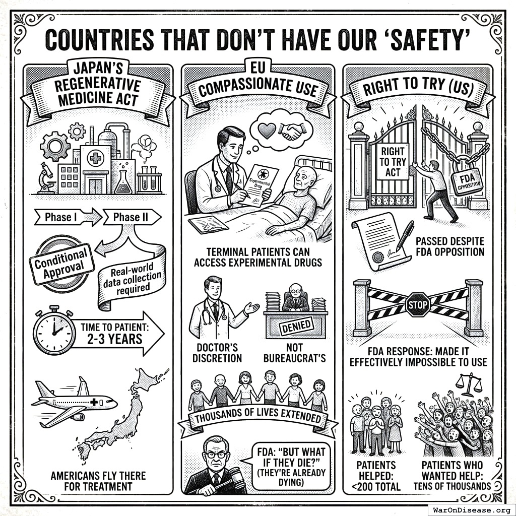 Japan approves experimental drugs fast. Europe approves them medium fast. America approves them after you die. Different cultures, different priorities.
