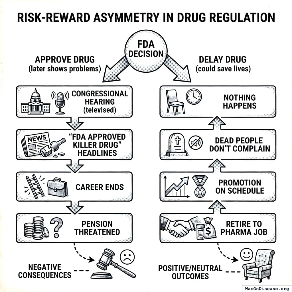 Approve a bad drug: fired. Delay a good drug: promoted. The system works exactly as designed, which is the problem.