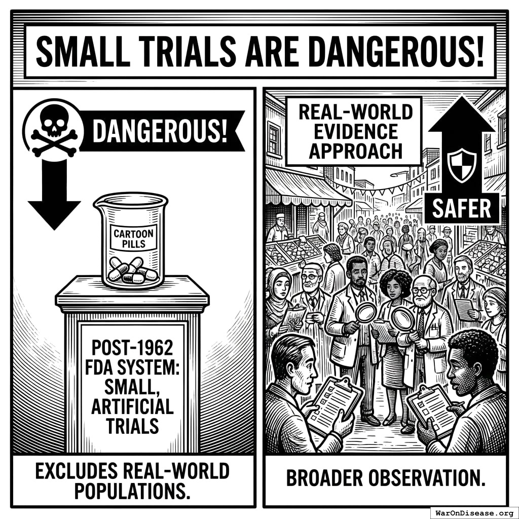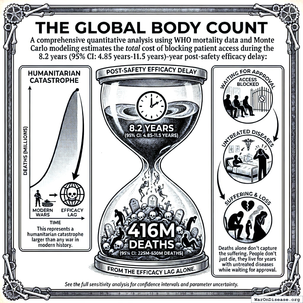 Even if those death estimates are off by a factor of 10, that’s still tens of millions of deaths. And the inefficiency is independently verifiable: the efficacy testing process costs 82x more per patient and takes 32.8x longer than proven alternatives like the Oxford RECOVERY trial. Those numbers don’t depend on mortality estimates at all.