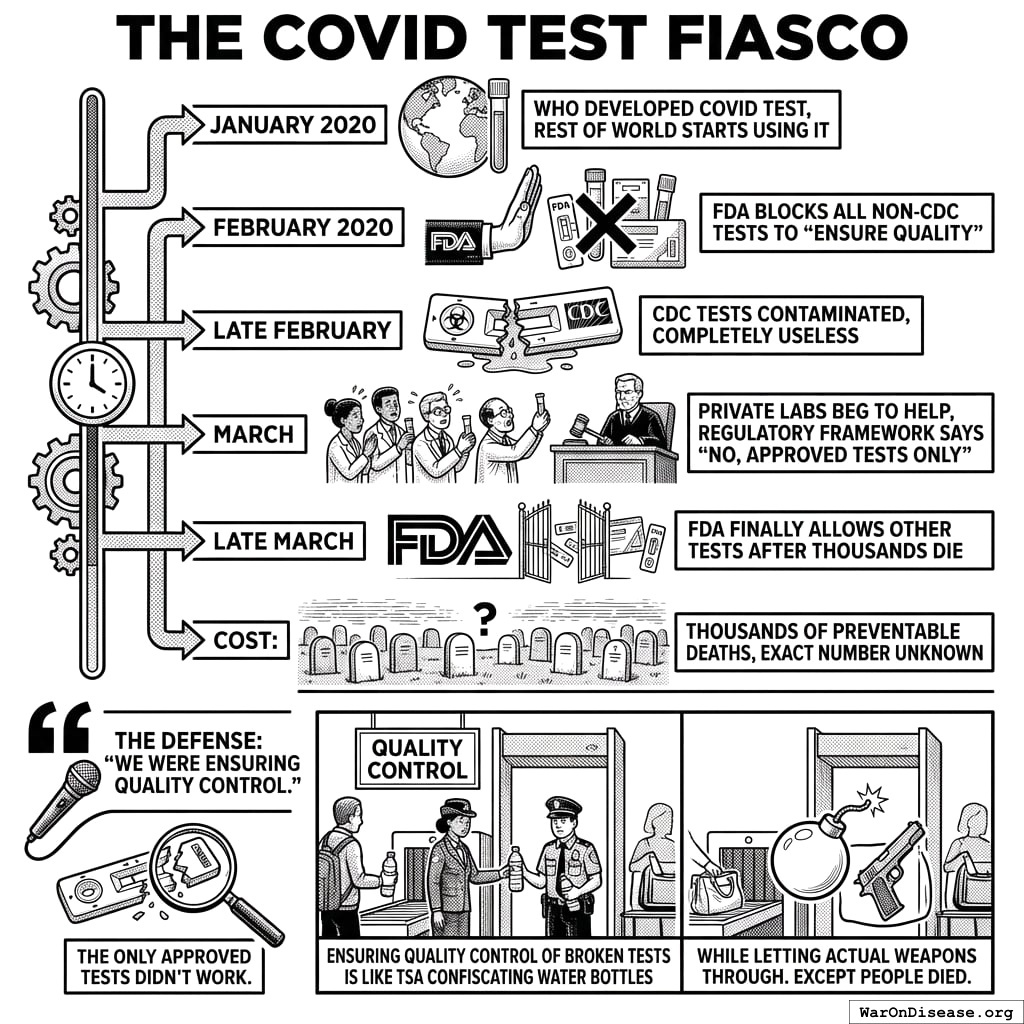 The only approved tests didn’t work. The unapproved ones did. The FDA blocked the ones that worked to ensure the quality of the ones that didn’t. I’ve written this paragraph four times now and it keeps sounding like I’m making it up, but I’m not. That is what happened. In order. On purpose.