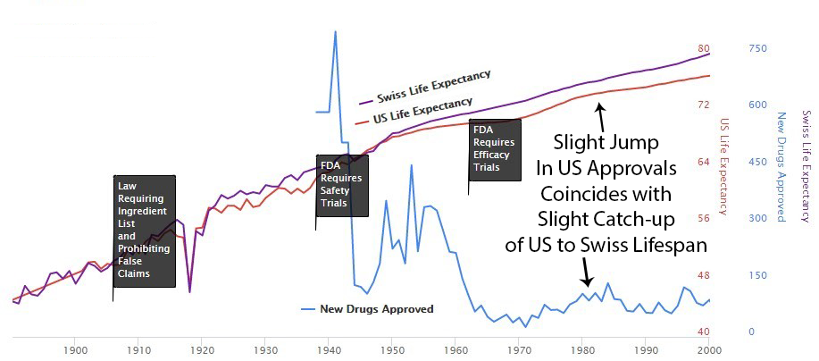 In 1962, Americans and Swiss people died at the same age. Then America made medicine safer. Now Americans die younger. This is what winning looks like.