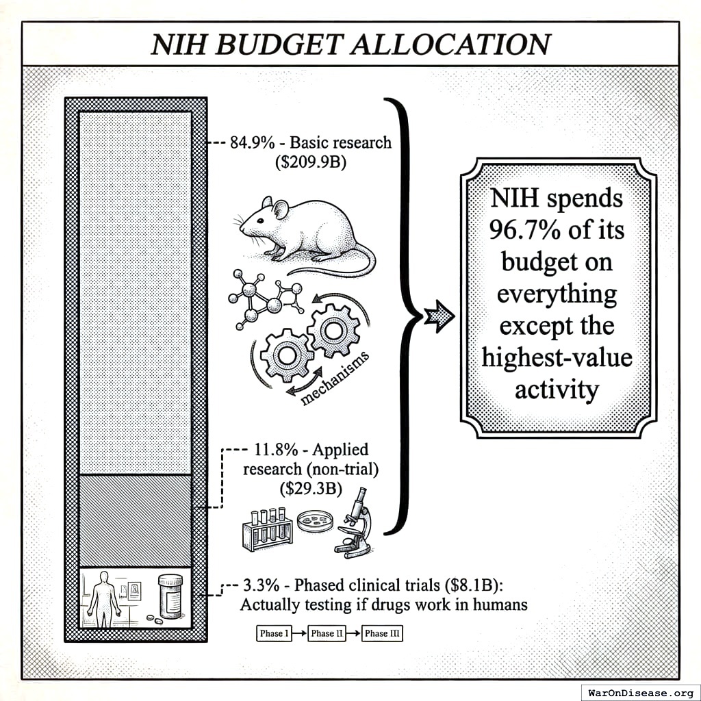 Of $247 billion the NIH spent over a decade, exactly 3.3% went to testing which of the thousands of known-safe treatments actually work in humans154. The other 96.7% funded understanding disease mechanisms, translating discoveries toward (but never into) clinical use, training scientists, observational programs that spend billions watching disease without treating it, and a side quest engineering bat viruses, which is called “research” the way watching someone drown from a boat is called “lifeguarding.”
