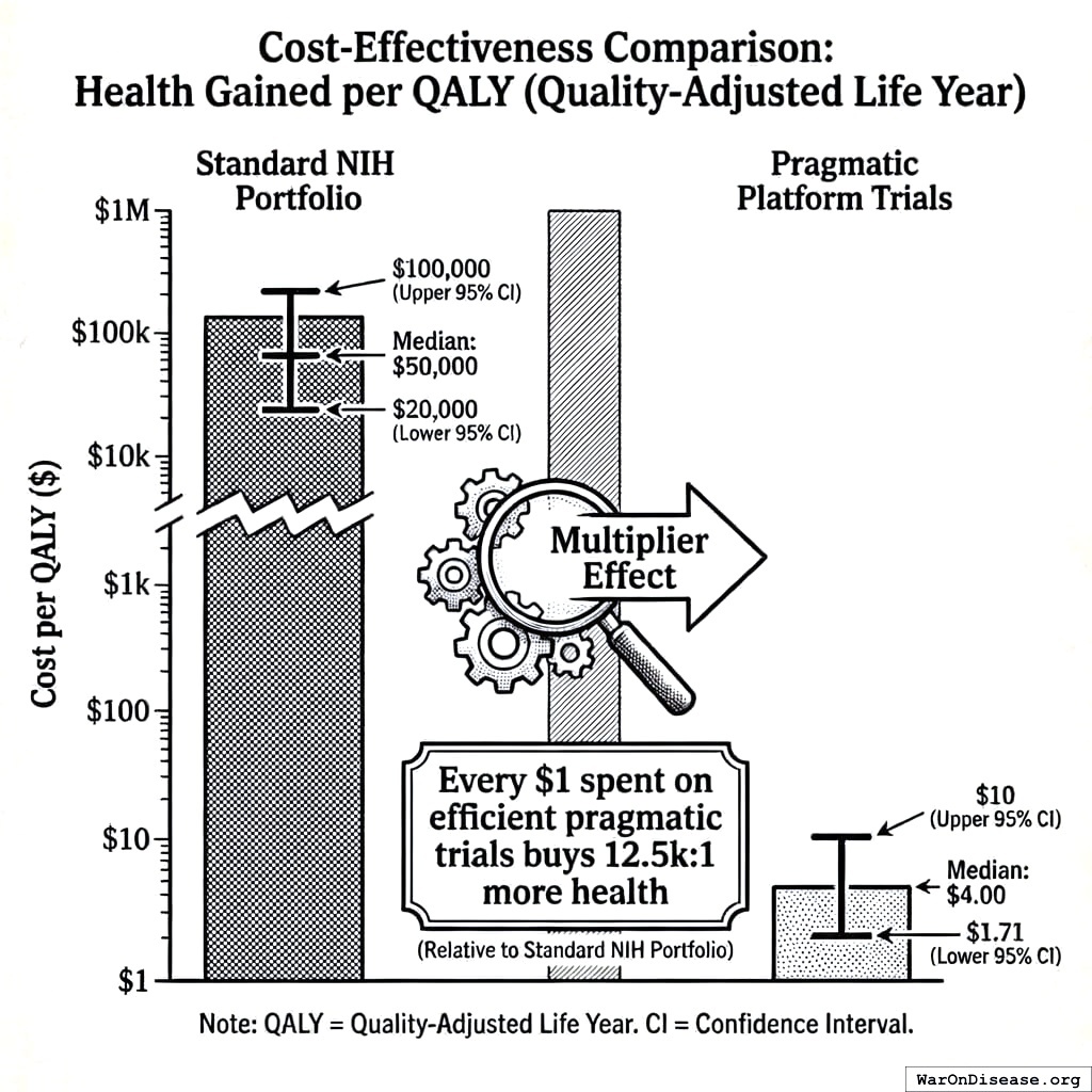Now imagine the other timeline. Not as an indictment, but as a measure of what was lost. If the NIH had allocated even 20% of its $1.1 trillion to pragmatic trials over 50 years (the remaining 80% still on basic research), that produces 440 million patient-trials at RECOVERY efficiency ($500 per patient). That is enough to test every safe compound against every major disease, multiple times, with replication. The Oxford RECOVERY trial tested 48,000 patients and found a treatment that saved over a million lives, in 100 days, for $24 million. Multiply that across 440 million patients and 50 years and the number of lives saved becomes difficult to calculate because the diseases start disappearing and the math changes.