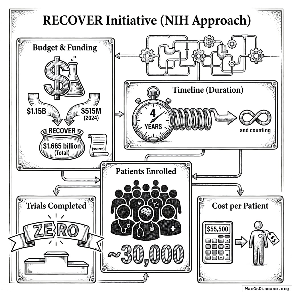 Nearly 600 potential treatments for Long COVID have been identified. At RECOVERY trial efficiency ($500/patient, 5,500 patients per treatment), $1.665 billion buys 600 completed trials. The NIH received $1.665 billion140. Over 4 years141, they completed zero141.