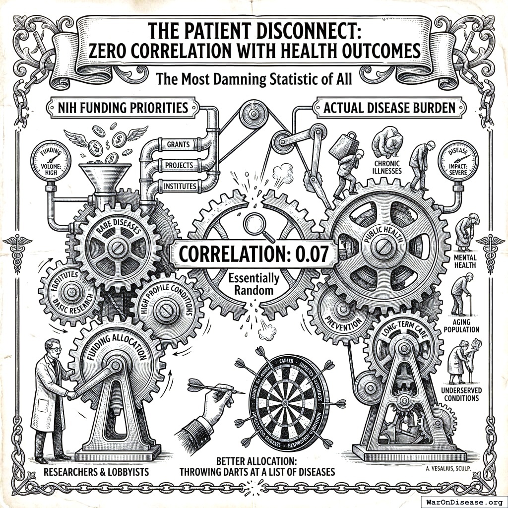 NIH funding has a 0.07 correlation with disease burden. That’s worse than random. A dart-throwing monkey would do better.