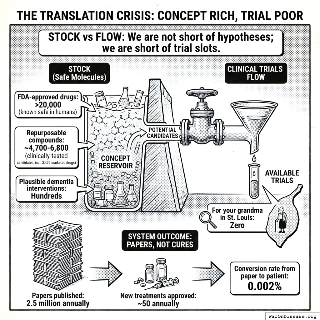 There are over 20 thousand FDA-approved drugs that are known to be safe in humans. Thousands more clinically-tested candidates are gathering dust145, including over 3,000 marketed drugs that could be repurposed for diseases nobody’s tried them on. In Alzheimer’s alone, researchers have identified hundreds of safe drugs worth testing, yet less than 10% are in active trials146. And the number of clinical trials available for your grandma in St. Louis? Zero. You have a warehouse of safe molecules that have never been systematically tested for new uses. The warehouse is full. The testing facility is closed for a team-building retreat.