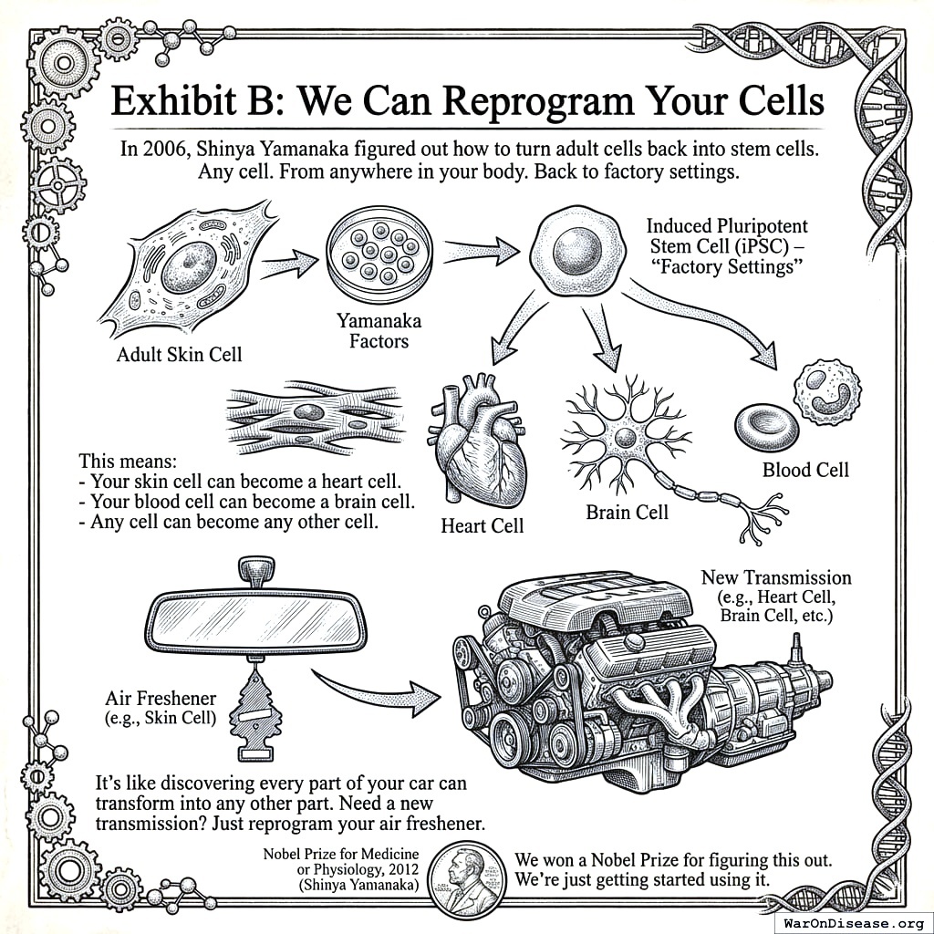 In 2006, Shinya Yamanaka figured out how to turn adult cells back into stem cells140. Any cell. From anywhere in your body. Back to factory settings. Like holding down the reset button, except on a skin cell. And it works.