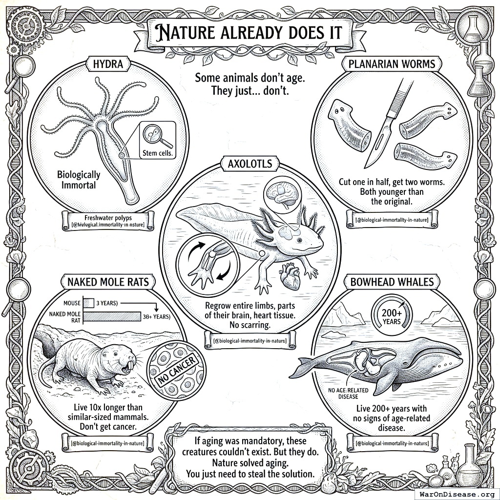 Wikipedia: Biological Immortality https://en.wikipedia.org/wiki/Biological_immortality Hydra: Biologically immortal - no mortality increase over 4-year study, kept alive 12+ years Planarian worms: Somatically immortal with limitless telomere regeneration, clonal lines >15 years Axolotls: Regrow limbs, brain parts, heart tissue through remarkable regeneration Naked mole rats: Live 37+ years (10x similar rodents), cancer-proof, no age-related mortality increase Bowhead whales: Live 200+ years, unique DNA repair mutations, extra cancer-suppression genes Note: These animals demonstrate enhanced DNA repair, abundant stem cells, telomerase activity, and cancer resistance Additional sources: https://en.wikipedia.org/wiki/Biological_immortality | https://pmc.ncbi.nlm.nih.gov/articles/PMC5807068/