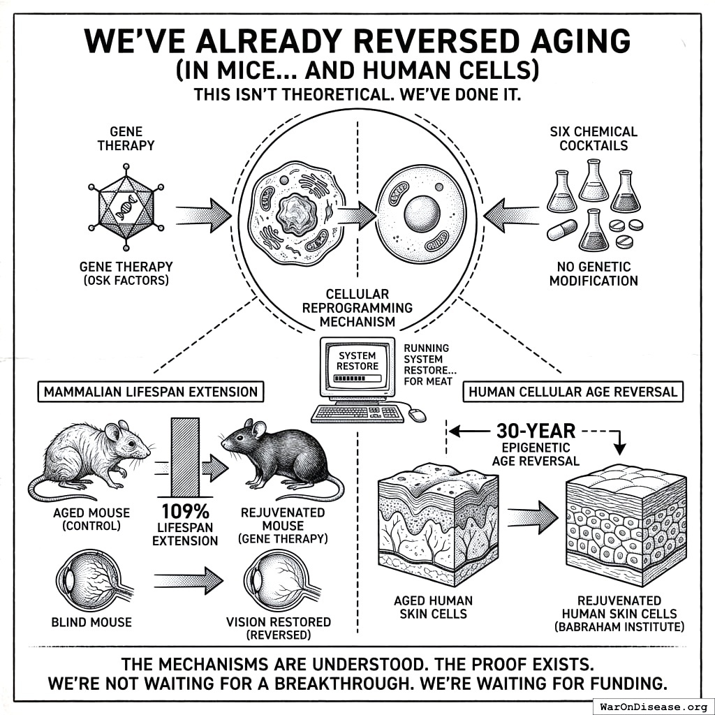 Harvard/Sinclair: Loss of epigenetic information causes aging; restoring epigenome integrity reverses aging signs in mice OSK therapy (Oct4, Sox2, Klf4): Ectopic induction can restore youthful DNA methylation patterns, transcript profiles, and tissue function without erasing cellular identity Results in mice: Systemically delivered adeno-associated viruses encoding inducible OSK in 124-week-old mice extended median remaining lifespan by 109% over wild-type controls Vision restored in glaucoma mice - first successful reversal (not just halting progression) Cyclic partial reprogramming (2 days on, 5 days off) showed improvements after just 6 weeks including reduced age-related spinal curvature Human cells: Babraham Institute showed cellular reprogramming reverses epigenetic age of human skin cells by 30 years Chemical alternatives: Six chemical cocktails identified that restore youthful genome-wide transcript profile in less than a week without compromising cellular identity Note: Demonstrates biological aging is reversible, not inevitable; safety testing ongoing before human application Additional sources: https://pmc.ncbi.nlm.nih.gov/articles/PMC10373966/ | https://www.nature.com/articles/s41467-024-46020-5 | https://www.liebertpub.com/doi/10.1089/cell.2023.0072 | https://clinicalepigeneticsjournal.biomedcentral.com/articles/10.1186/s13148-021-01158-7