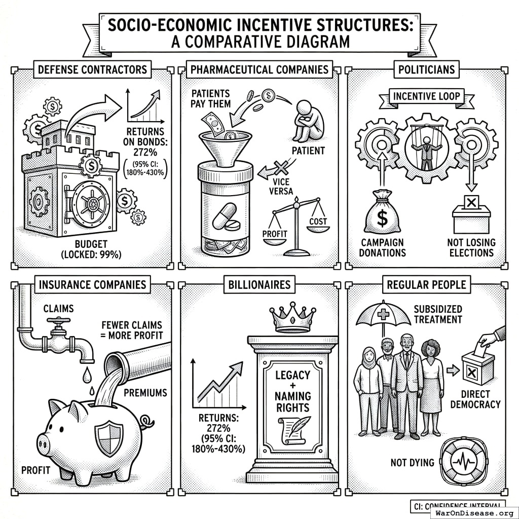 Defense contractors: Keep 99% of budget + 272% returns on bonds Pharmaceutical companies: Patients pay them instead of vice versa Politicians: Campaign donations + not losing elections Insurance companies: They want you either dead or immortal, anything but expensively lingering. Cures help. Billionaires: 272% returns + legacy + naming rights Regular people: Subsidized treatment + direct democracy + not dying