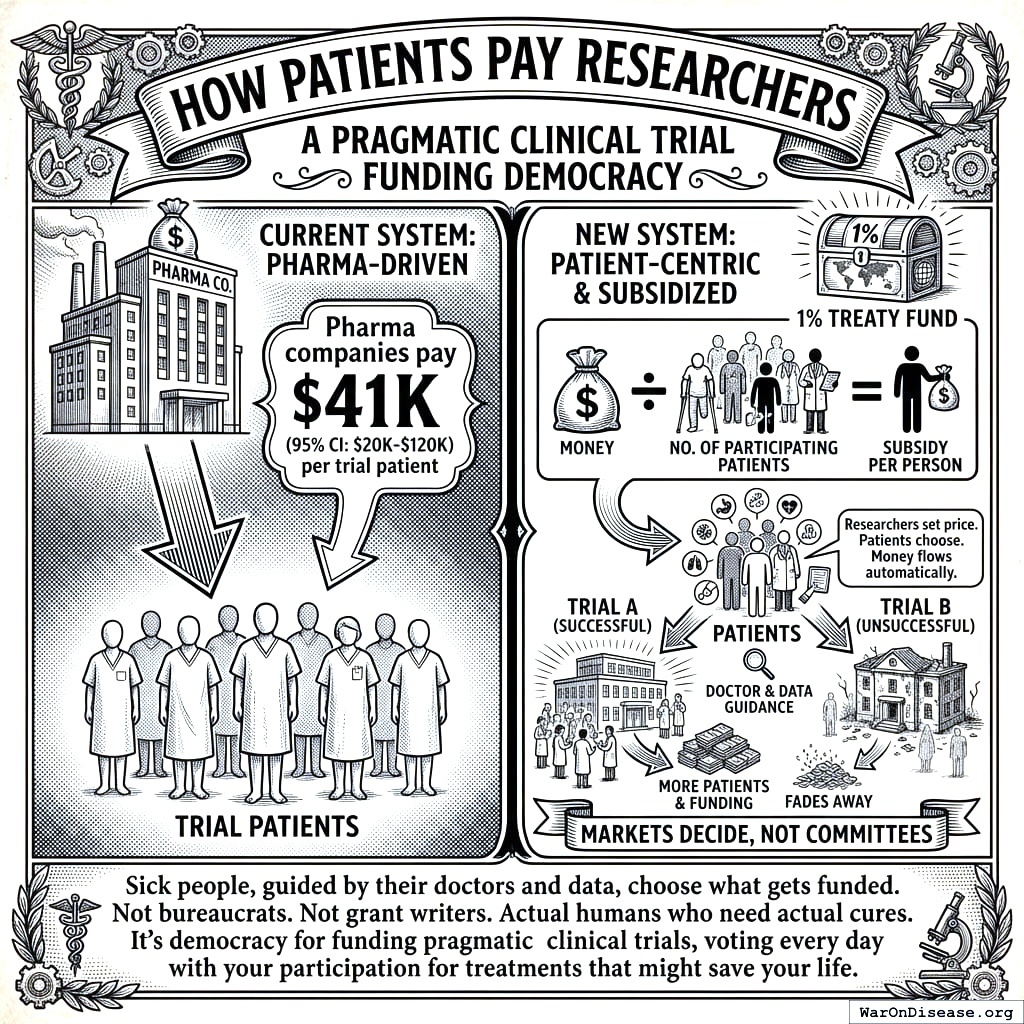 Researchers set their own price. Patients choose which trials to join. Money flows automatically. Markets decide, not committees. Sick people, guided by their doctors and data, choose what gets funded. Not bureaucrats. Not grant writers. Actual humans who need actual cures.