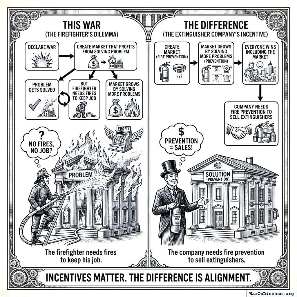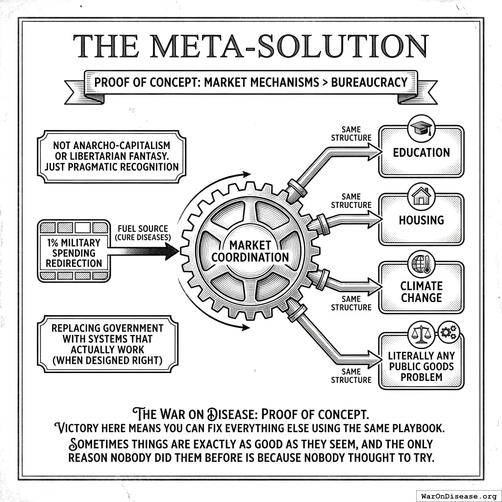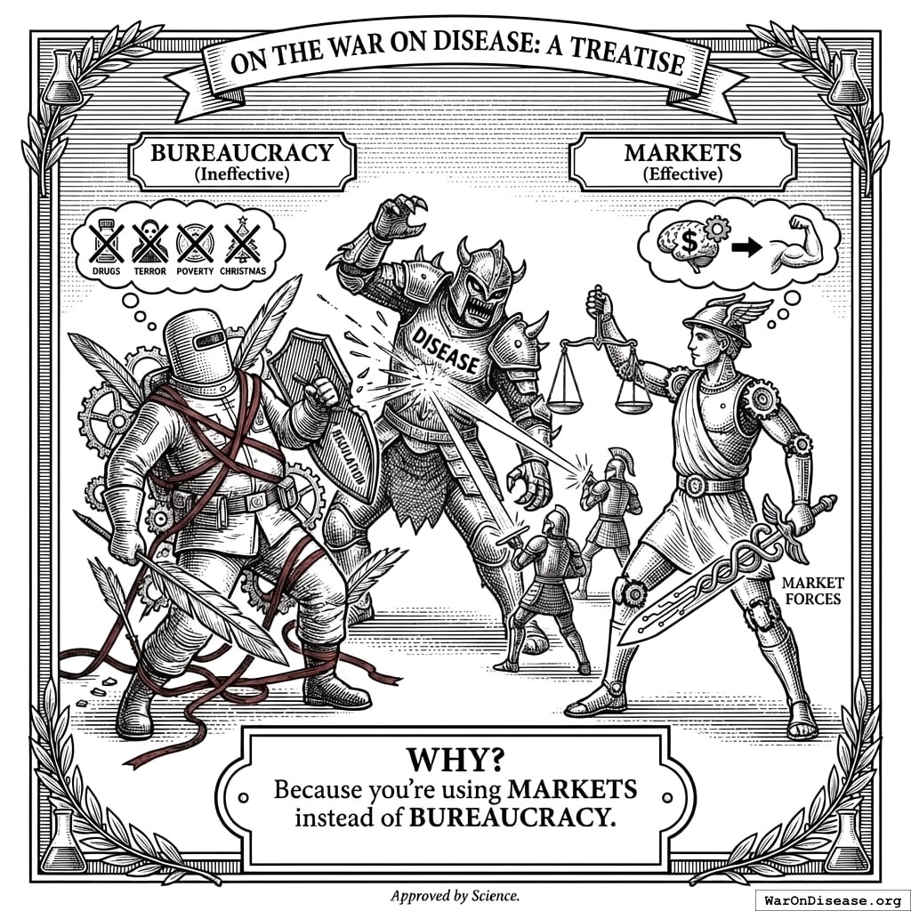 You’re declaring war on disease. But unlike previous wars on abstract concepts (drugs, terror, poverty, Christmas), this one will actually work. You’re using markets instead of bureaucracy.