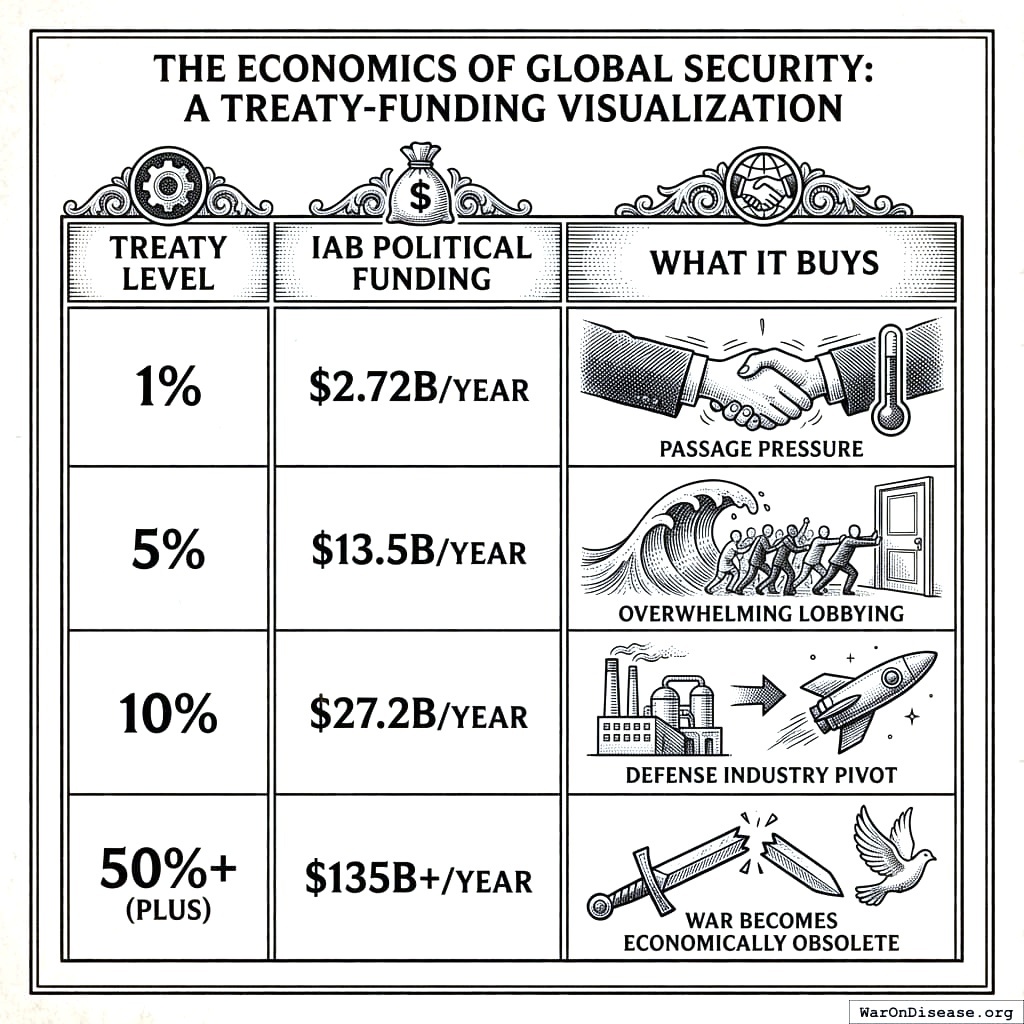 The 10% going to Incentive Alignment Bonds142 creates a perpetual political machine that pushes for expansion. When 1% passes, $2.72B/year flows to people whose entire financial interest is getting the treaty to 2%. When 2% passes, the pressure doubles. The political pressure for expansion accelerates with each success. This creates a ratchet that can eventually redirect all military spending from war to health.
