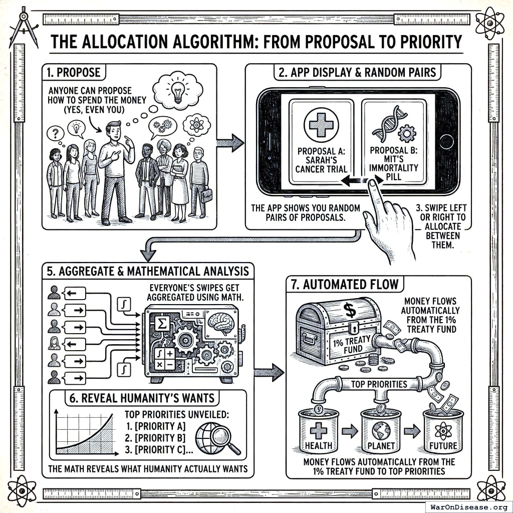 Anyone can propose how to spend the money. The app shows you random pairs of proposals. You swipe left or right. Everyone’s swipes get aggregated using math. Money flows automatically to top priorities. No committee. No gatekeepers. Just billions of micro-decisions that add up to what humanity actually wants, not what 200 people in suits think humanity wants.