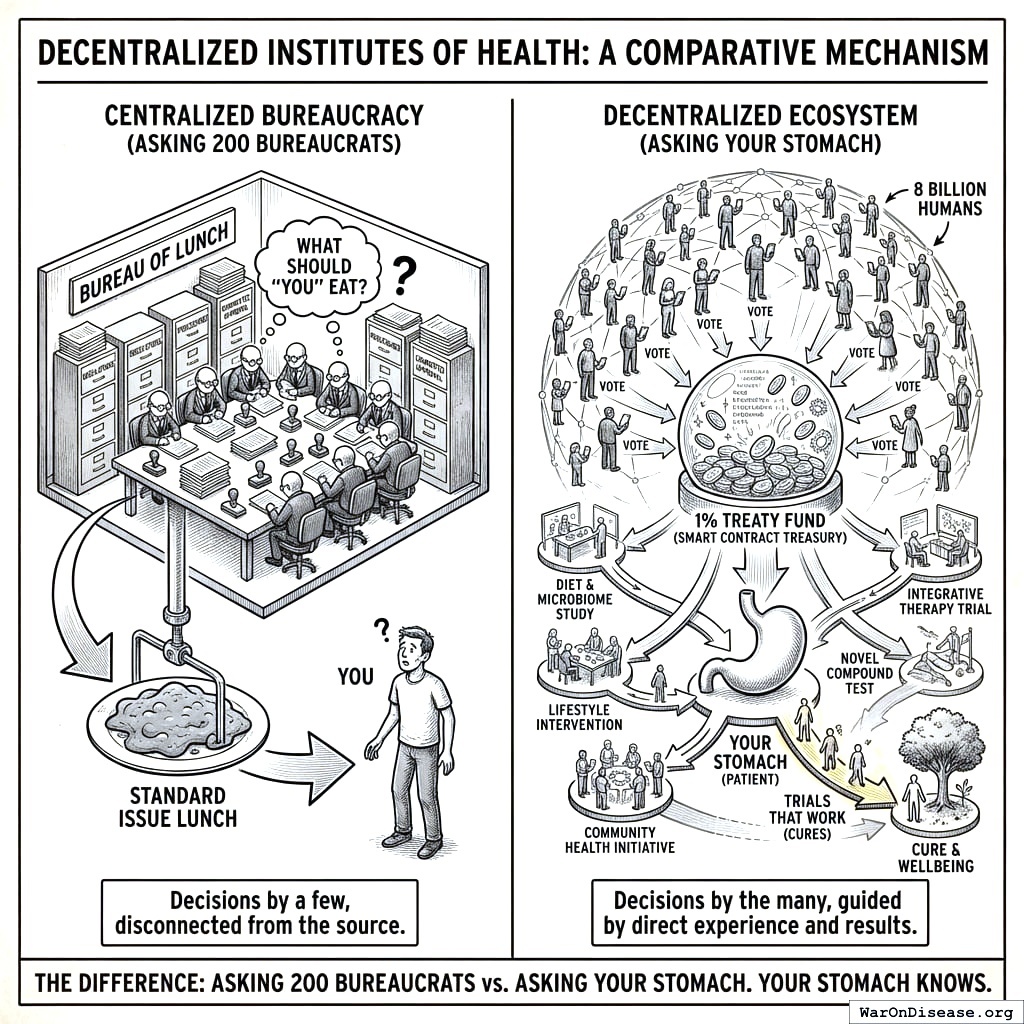 Once your 1% Treaty is ratified, that $27.2B per year flows into a 1% Treaty Fund. It’s a rules-governed treasury designed to minimize discretion. The treaty fixes the top-level allocation. Patients direct trial-participation spending. Wishocracy141 governs the collective-choice layer. Administrative entities maintain the rails, but they do not get to improvise the formula.