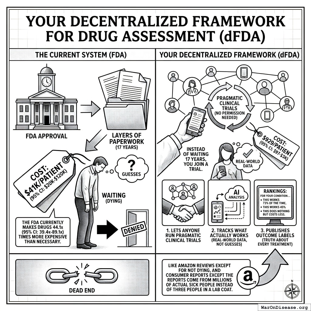 Instead of waiting 14 years from discovery to patient while you die, you join a trial. It costs $929 instead of $41K. You report outcomes through your phone. The AI analyzes millions of data points. The framework publishes rankings: “For your condition, this works 73% of the time, this works 45%, this does nothing but costs less.”
